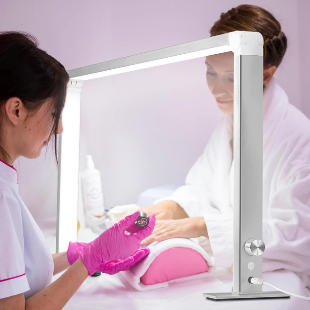 Профессиональная настольная LED лампа подходит для маникюра, nail-дизайна, съёмки работ и комфортного освещения рабочего стола. Удлинённая форма 86 × 40 × 13 см помогает равномерно освещать большую рабочую зону и снижать количество теней во время работы.